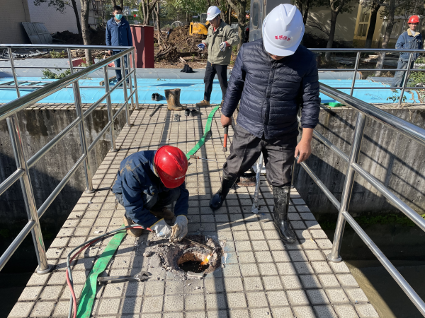 11月10日,在三水廠一期回收水池上,幾名機修工正在進(jìn)行切割拆除工作,完成原有舊設(shè)備拆除后,他們將進(jìn)行回收水池攪拌系統(tǒng)升級改造。